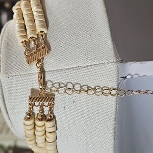 Elevate your style with this stunning multicolor beaded necklace. Featuring a blend of cream, tan, and gold beads, this piece adds a touch of elegance to any outfit.