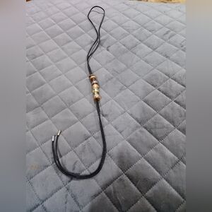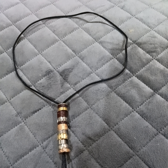 Stylish necklace with multicolor beads. Features black, brown, gold, and silver tones. make the necklace looser or tighter by sliding the beads up or down.