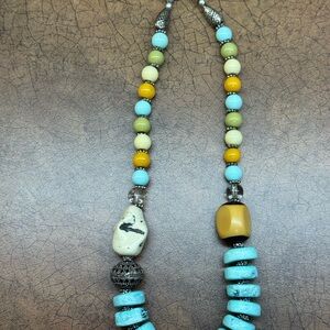 Elegant multicolor beaded necklace featuring turquoise, yellow, and cream beads. Perfect for adding a pop of color to any outfit. 18 1/2 inch