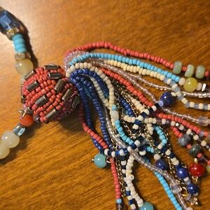 This vibrant multicolor beaded necklace is a stunning addition to any jewelry collection. Featuring a mix of blue, red, and gold beads, it offers a unique and eye-catching design. Perfect for adding a pop of color to your outfit. 30" length. Gift bag included and excellent condition.