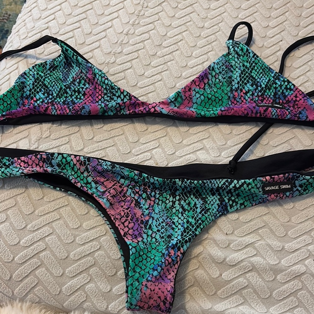 This is reversible and can be worn a combo of ways. Size medium. Bottoms are very minimal coverage. Some color fading.