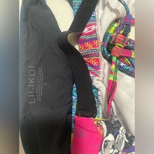 Vibrant multicolor bikini set perfect for a stylish beach day. Features a colorful top with a blue bottom for a chic look.