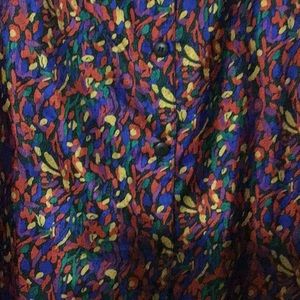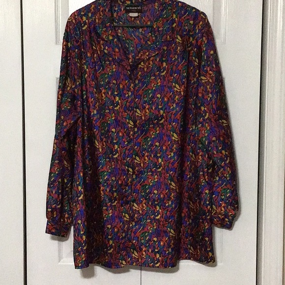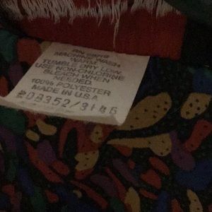 This multicolor top has a silky feel and a rich look,but it is 100% washable polyester. The design is great for a fun night out or day at the office.