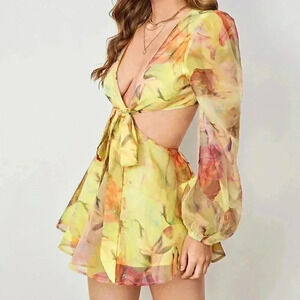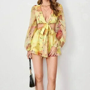 Multicolor Boho Lantern Sleeve Knot Cutout Waist Chiffon Romper