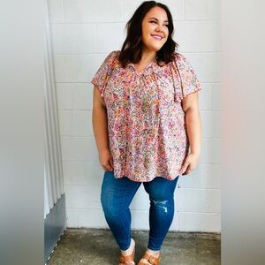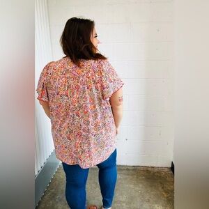 Crepe boho paisley print and a front tie make this top unique. Made with short flutter sleeves and a loose fit, this top is perfect for cool days.