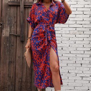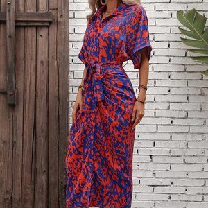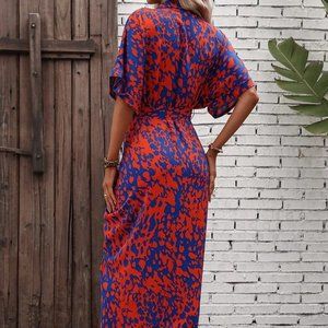 Multicolor Boho Womens Allover Print Batwing Sleeve Belted Shirt Dress