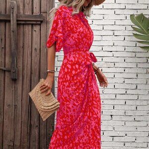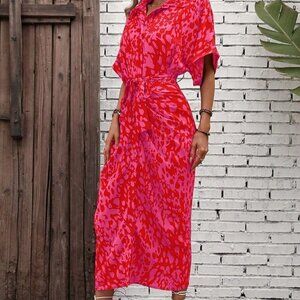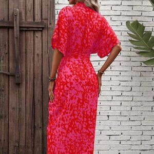 Multicolor Boho Womens Allover Print Batwing Sleeve Belted Shirt Dress