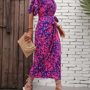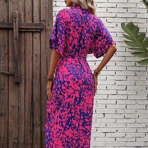 Multicolor Boho Womens Allover Print Batwing Sleeve Belted Shirt Dress