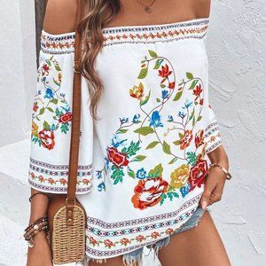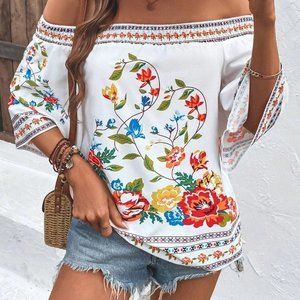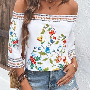 Multicolor Boho Womens Floral Print Off Shoulder Blouse travel summer trends