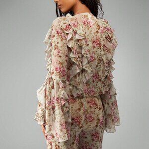 Multicolor Boho Women's Floral Ruffled Chiffon Long Sleeve Tie Front blouse