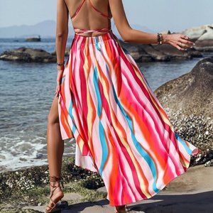 Multicolor Boho Womens Lace Up Backless Split Thigh Cami Dress
