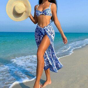 Multicolor Boho Women's Plant Print Underwire Bikini & Mesh Overskirt Set
