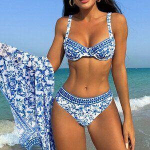 Multicolor Boho Women's Plant Print Underwire Bikini & Mesh Overskirt Set