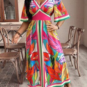 Multicolor Boho Women's Plus Size Vacation Casual Plant Printed High-Waist Long