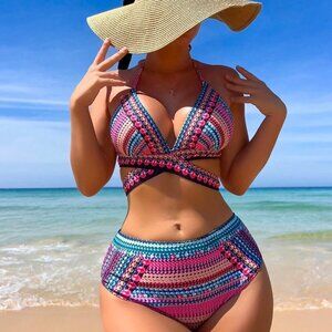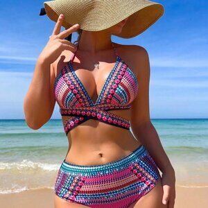 Multicolor Boho Womens Print Halter Triangle High Waisted Bikini Swimsuit