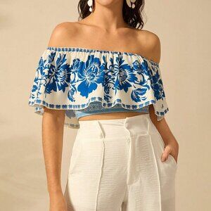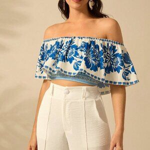 Multicolor Boho Women's Summer Flower Printed Flounce Off-Shoulder Crop Top