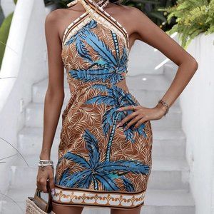 Multicolor Boho Womens Tropical Print Tie Backless Halter Dress