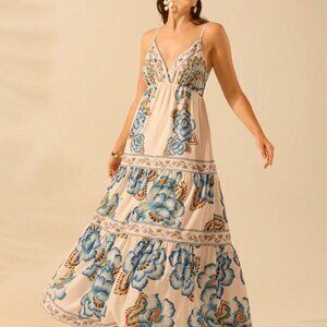 Multicolor Boho Women's Tropical Print V-Neck Long Camisole Dress Beach Dress