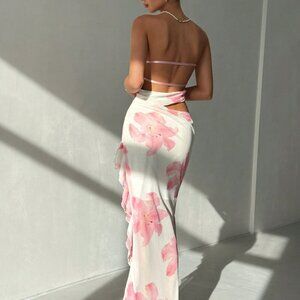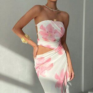 Multicolor Boho Women's Tropical Vacation Floral Tube Top Ruffle Mesh Long Dress