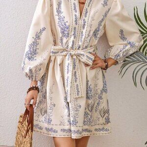 Multicolor Boho Women's Women's Lantern Sleeve Belted V-Neck Dress