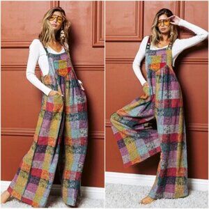 Multicolor Brushed Fabric Checkered Plaid Wide leg Jumpsuit