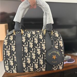 Chic bucket bag with vibrant monogram design. Features tan leather accents and bow detail.