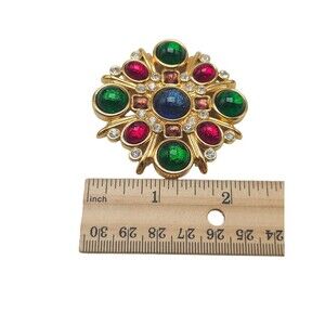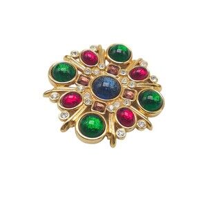 Multicolor Cabochon Rhinestone Glass Star Medallion Brooch Pin Gold Tone Vintage