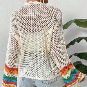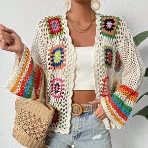 Multicolor Casual Womens Braided Hollow Out Holiday Long Sleeve Open Cardigan