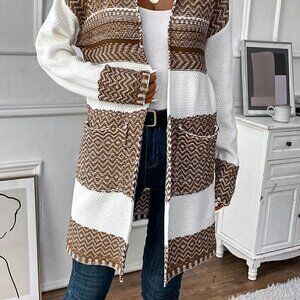 Multicolor Casual Womens Chevron Drop Shoulder Pocket Patched Duster Cardigan