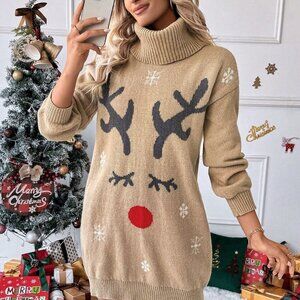Multicolor Casual Women's Christmas Reindeer Print Lantern Sleeve Sweater Dress