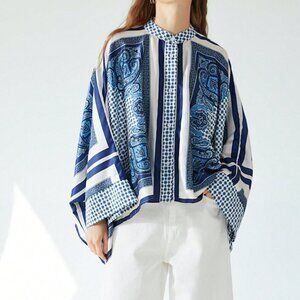 Multicolor Casual Women's Color Block Print Cuff & Hem Design Blouse