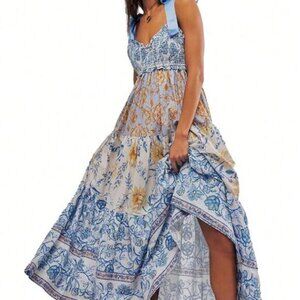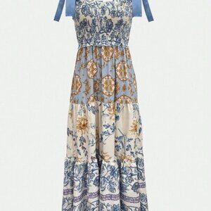 Multicolor Casual Women's Floral Print Lace-Up Spaghetti Strap Pleated Dress