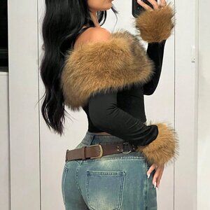 Multicolor Casual Women's Fluffy Collar Splice Off Shoulder Long Sleeve T-Shirt