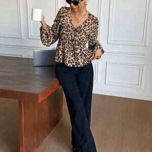 Multicolor Casual Women's Front Tie Long Sleeve Leopard Print Shirt