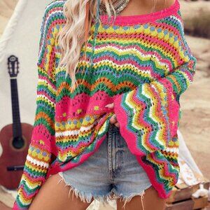 Multicolor Casual Women's Hollow Out Wave Pattern Long Sleeve Pullover Sweater