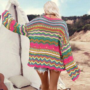 Multicolor Casual Women's Hollow Out Wave Pattern Long Sleeve Pullover Sweater
