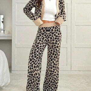 Multicolor Casual Women's Knit Sweater & Wide Leg Leopard Print Pants Set