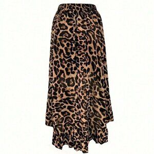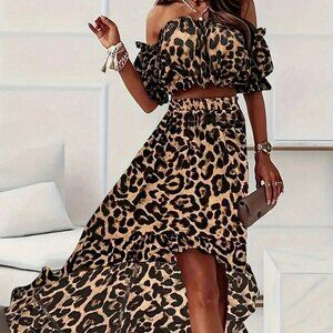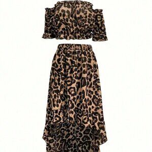 Multicolor Casual Women's Leopard Print Off Shoulder Cropped Shirt With Ruffled