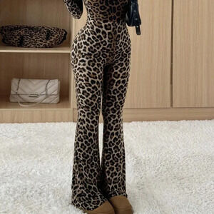 Multicolor Casual Women's Leopard Print Square Neck Long Sleeve Flared Jumpsuit