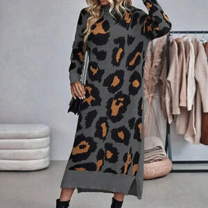 Multicolor Casual Women's Leopard Print Turtleneck Sweater Dress
