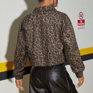 Multicolor Casual Women's Long Sleeve Leopard Print Washed Denim Jacket