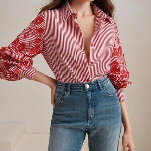 Multicolor Casual Women's Loose & Striped Patchwork Embroidered Shirt