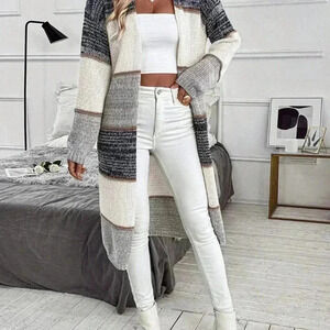 Multicolor Casual Women's Patchwork Loose Dual Pocket Long Cardigan