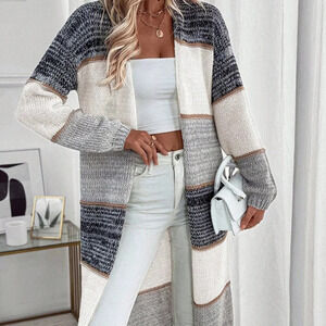 Multicolor Casual Women's Patchwork Loose Dual Pocket Long Cardigan