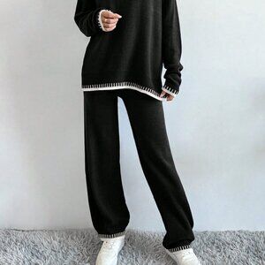 Multicolor Casual Women's Round Neck Drop Shoulder Sweater And Knitted Pants Set