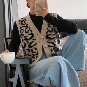 Multicolor Casual Women's Single Breasted V-Neck Leopard Print Knit sweater Vest