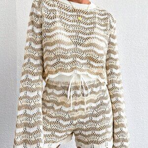 Multicolor Casual Women's Striped Hollow Out Knit Top & Shorts Cover Up Set