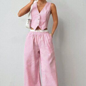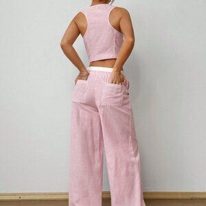 Multicolor Casual Women's Striped Sleeveless V-Neck Top And Pocket Pants Set