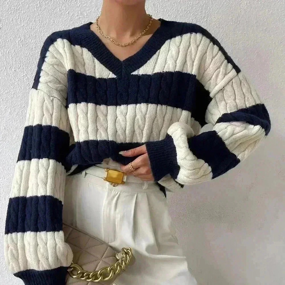 Multicolor Casual Women's Two Tone Cable Knit Drop Shoulder Sweater