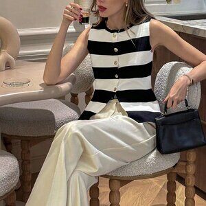 Multicolor Casual Women's Wide Stripe Round Neck button down knit vest top